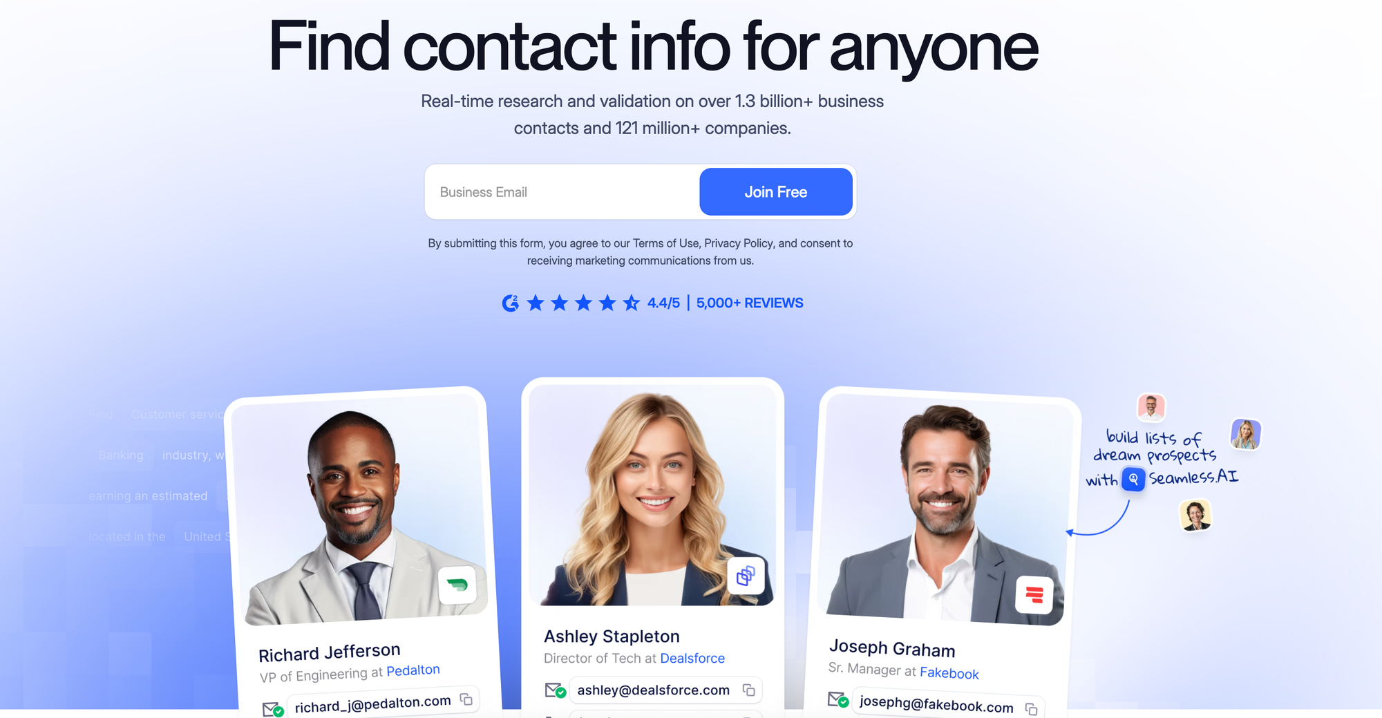 Seamless.AI leans on scale over precision. It constantly crawls the web to pull in new contact data, which helps it claim one of the largest databases in the industry, but that also means accuracy can vary depending on industry and region. It’s the kind of tool that suits teams sending thousands of cold emails daily rather than those who need every record to be perfect.