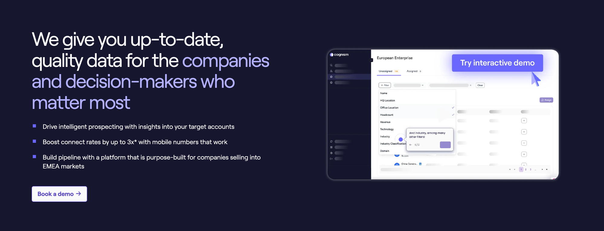 Cognism focuses on providing legally compliant, highly-verified mobile numbers (direct dials) and emails. They cover a huge database of over 400 million profiles and emphasize GDPR compliance, making them popular with companies that sell into the UK and EU.