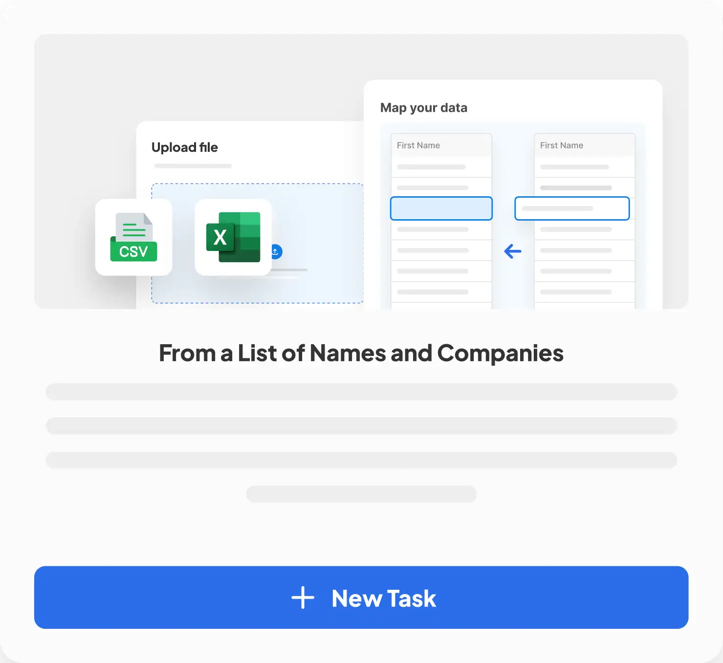 Turn lead lists from your CRM, events, or exports into verified, enriched data. Upload names or domains — no special formatting needed.